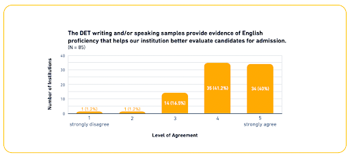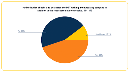 According to a Duolingo survey of institutions, 45% of respondents said DET writing and speaking samples are currently evaluated in the application process in addition to the test score data. A respondent from a private research university in the US shared, “The samples show us a snapshot of the student’s abilities when writing or speaking ‘on the fly'. It’s also a test against ChatGPT!”