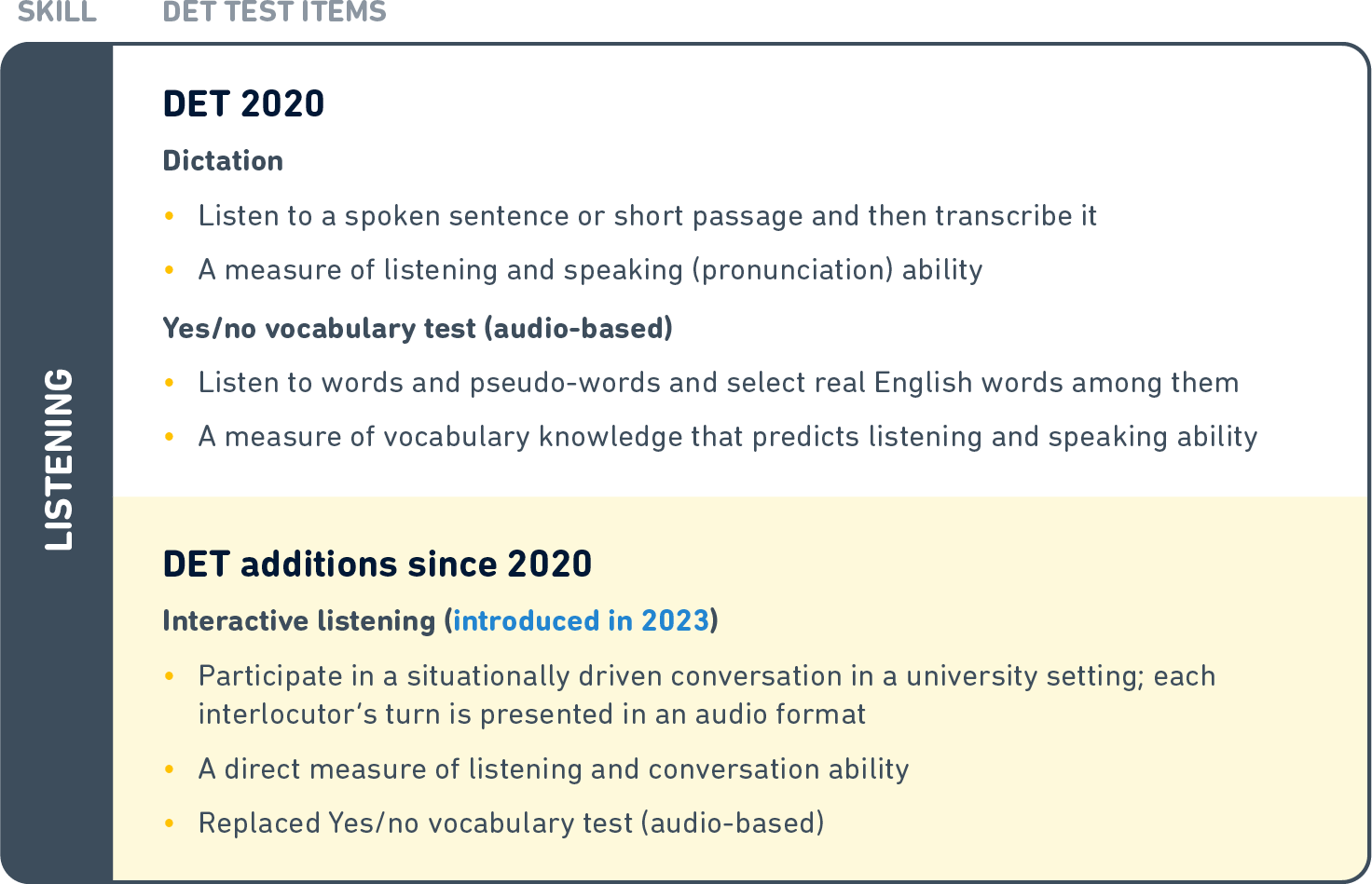 We’ve also revised the test’s concordance to match the growth the DET has experienced, as detailed in a recent Language Testing article, Practical considerations when building concordance between language tests. These improvements ensure a robust evaluation of a test taker's ability to understand and use English in academic settings, setting a new benchmark in language assessment.