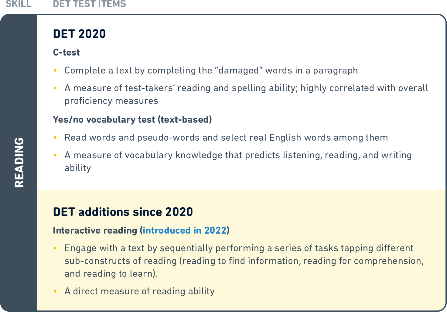 We aim to keep the DET at the forefront, ensuring it's both accessible and enjoyable. With a focus on innovation and delight, we're excited about bringing updates that improve the test, and the test taker experience!