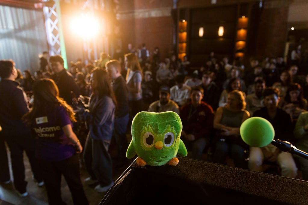Students asked thoughtful questions about education, technology, and social impact. Topics ranged from the limits of gamification to how Duolingo might foster critical thinking. The evening ended with a “streak showdown” hosted by Michael Lynas, Duolingo’s UK Country Director, where three students with streaks over 1,800 days won Duo plushies to thunderous applause.