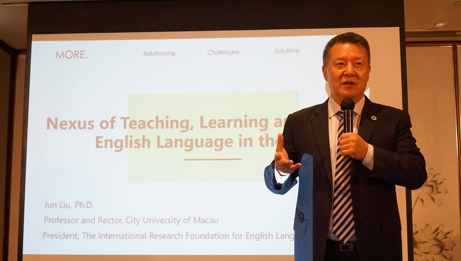 Jun Liu, the Rector of City University of Macau, launched the keynote speeches with his talk, "The Nexus of Teaching, Learning and Assessment of English Language in the Era of AI." Reflecting on his 2001 work on Asian students' classroom communication patterns, Liu discussed how the assessment of linguistic competence has evolved in the context of World Englishes. He highlighted the intersections and interrelationships of teaching, learning, and assessment, arguing for the need to leverage technologies in the AI era to provide inclusive learning experiences that embrace diverse English language varieties.