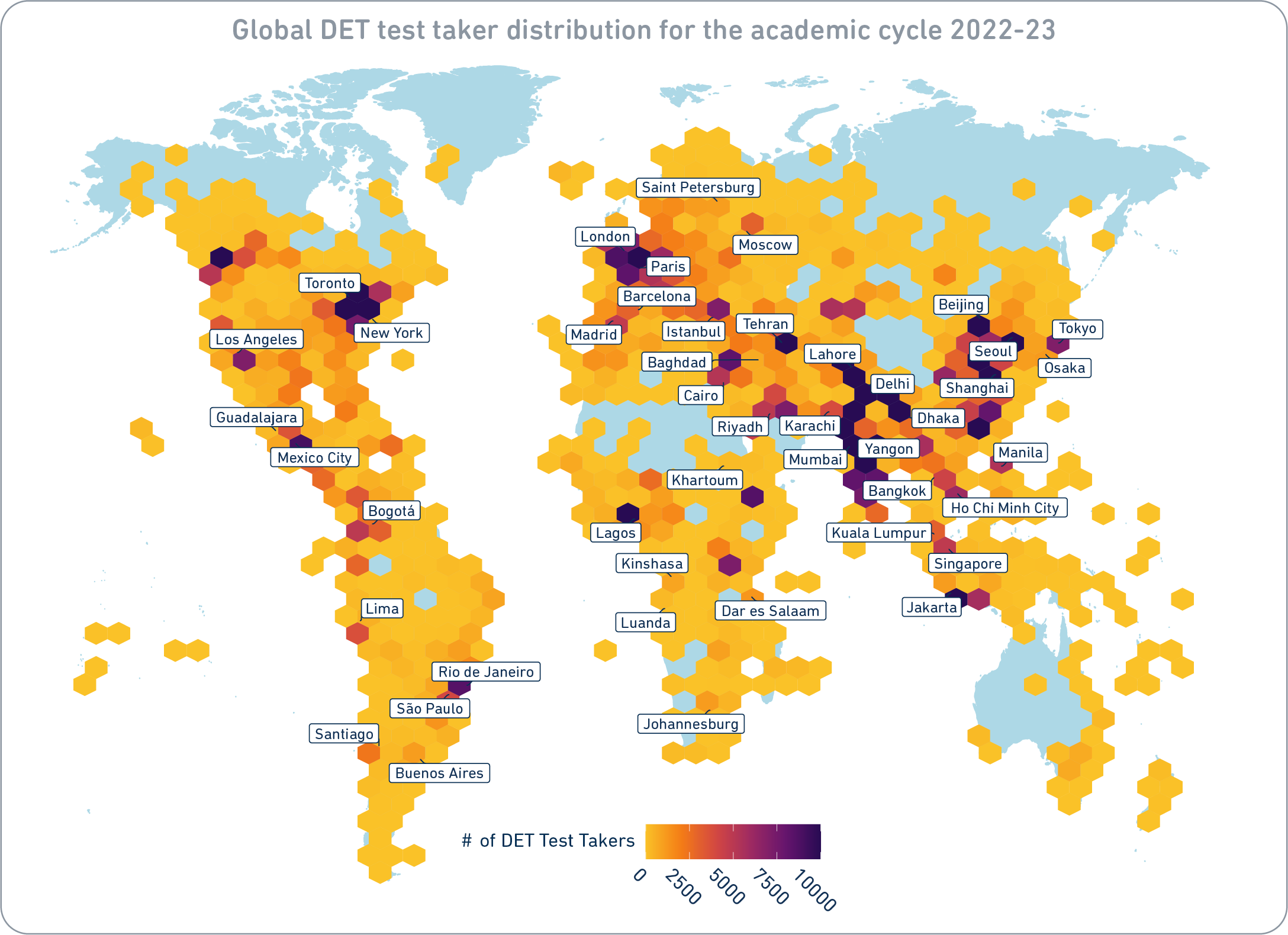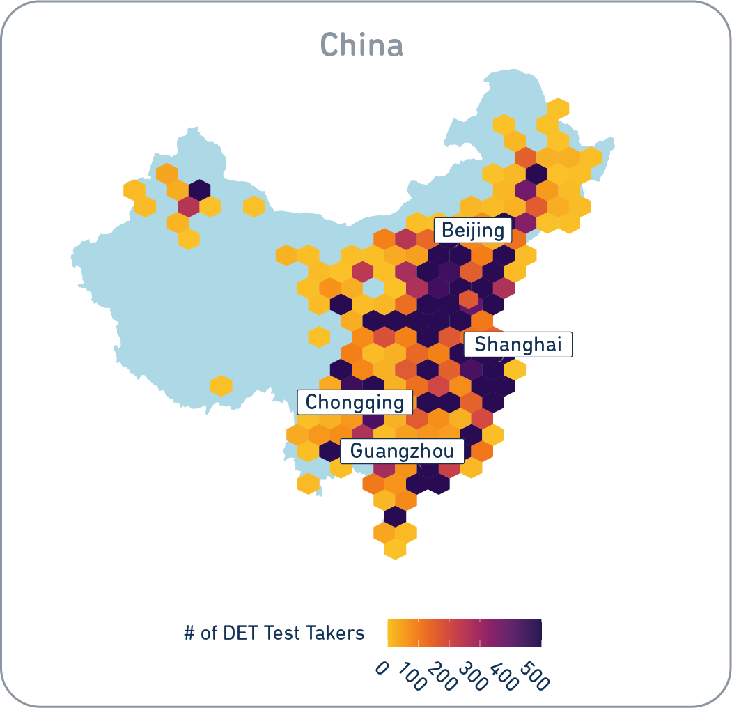 There are 55 cities in the world that have hosted more than 5,000 DET test takers, and a further 200 with test taker volumes over 500. In Burundi, Bujumbura had just over 500 students take the DET last cycle, as did Léon in Mexico and Freetown in Sierra Leone. Around the world, nearly 70,000 cities, towns and villages have hosted smaller populations of intrepid students who want to study internationally. And thousands of tests have been taken in countries that don’t have any access to test centers at all.
