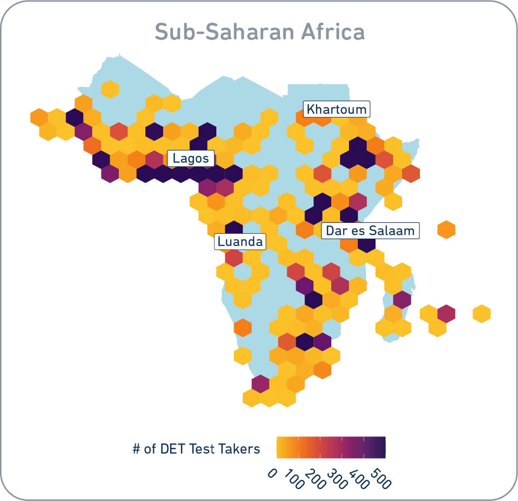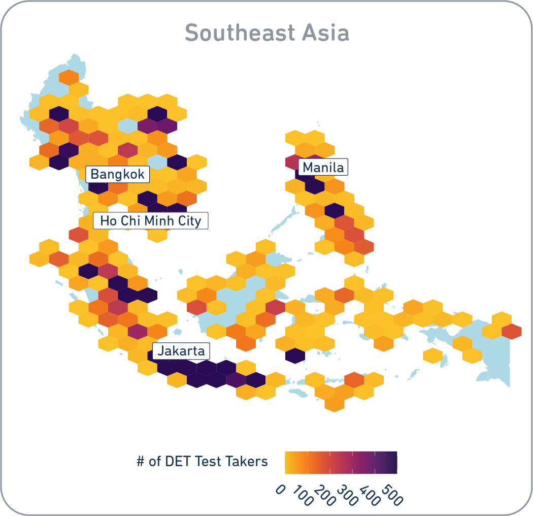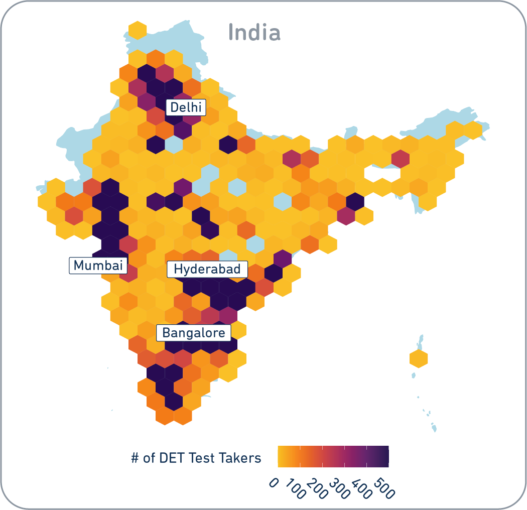 *Test taker location data is based on the geolocation of IP addresses based on test uploads. In the graphics, the DET test takers' locations have been jittered by ‘at most’ 1 degree in both latitude and longitude for privacy purposes.
