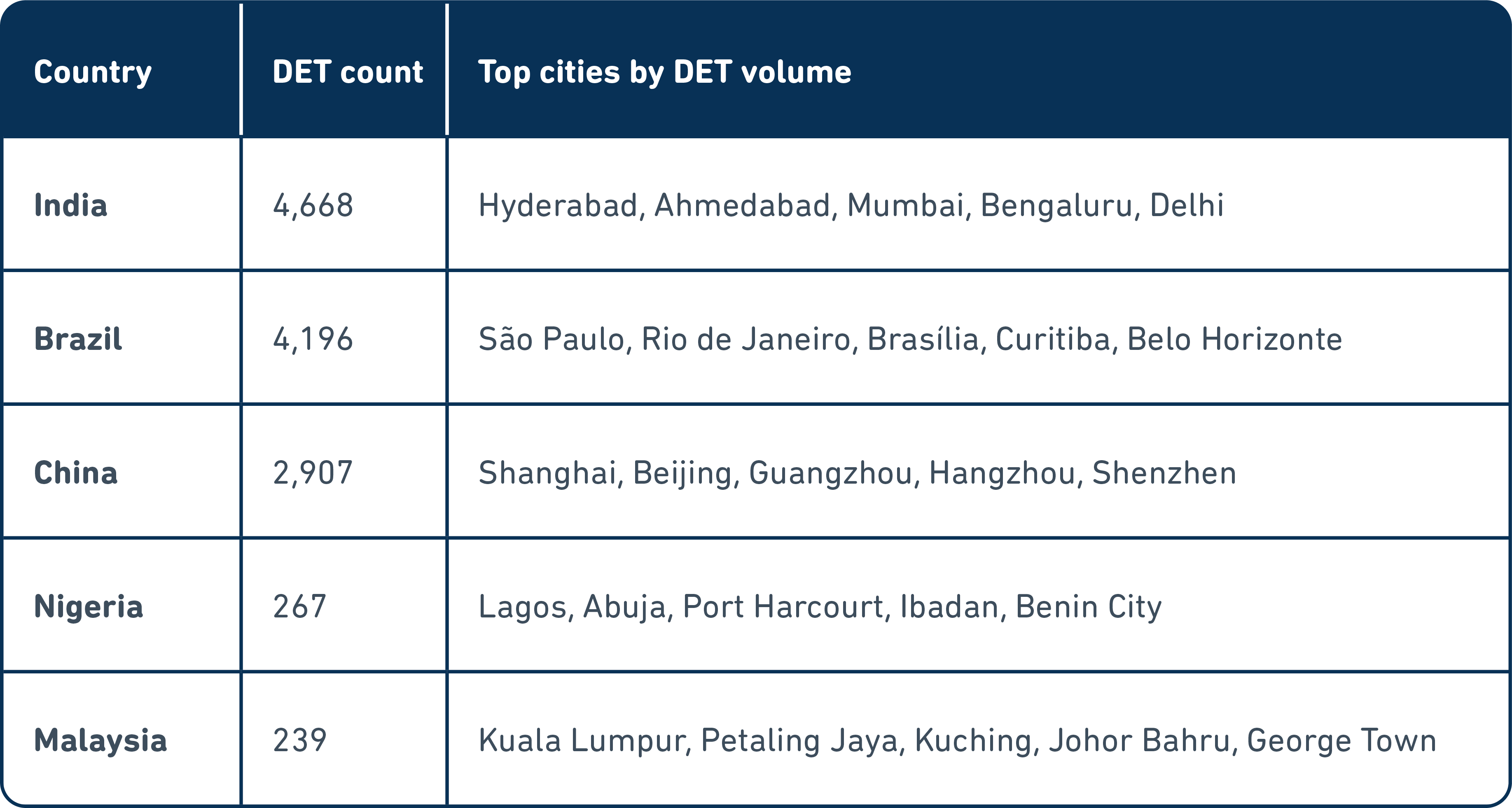 Table: DET location counts in a sample of key markets